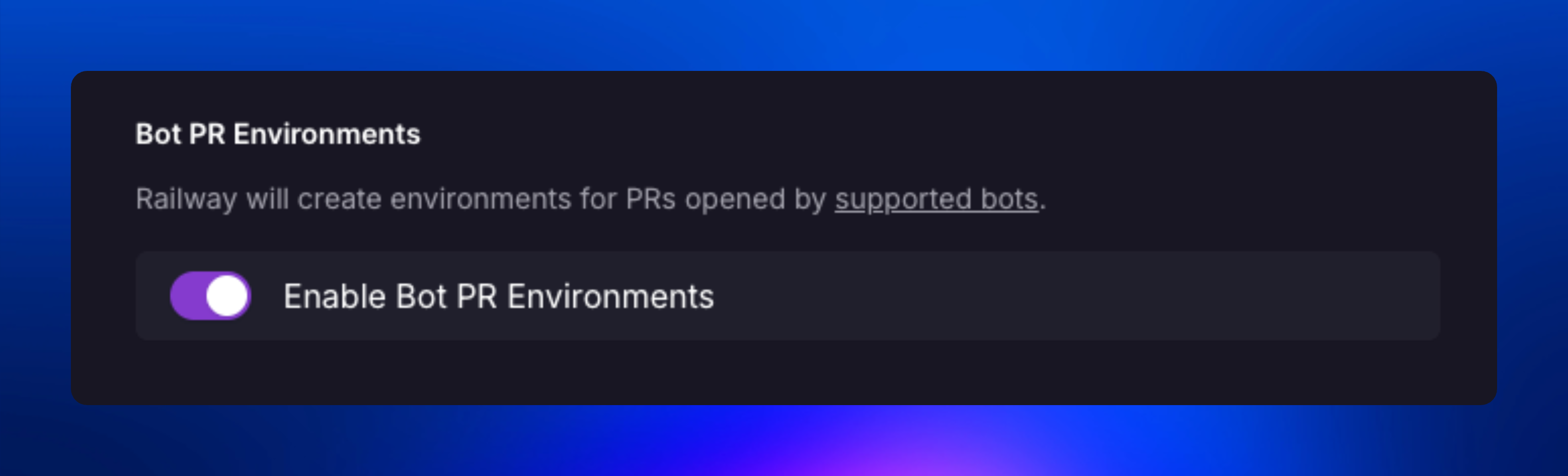 You can enable automatic PR environment creation for PRs opened by supported GitHub bots using the Enable Bot PR Environments toggle on the Environments tab in the Project Settings page.