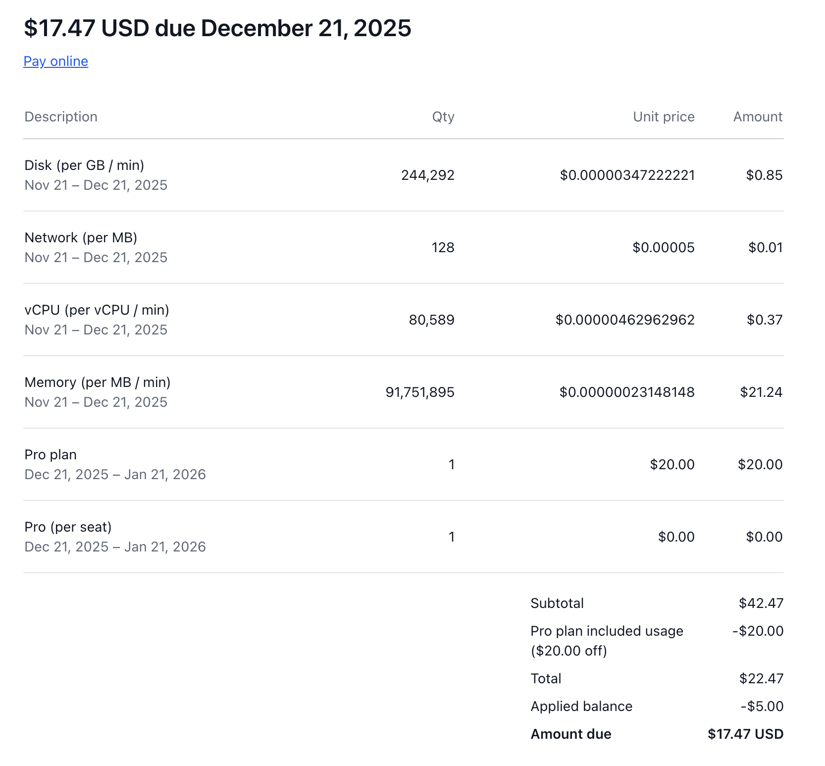 Example (Pro plan): Your December 21 invoice includes: