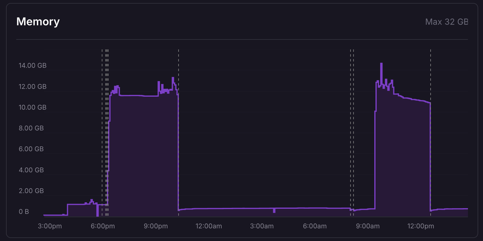 On other platforms you pay for the maximum available vCPUs and Memory. On Railway, you're only paying for usage, or in the below screenshot, the filled in purple area. This enables your workloads to still burst up to the maximum available resources you have configured, with no tradeoffs on cost.